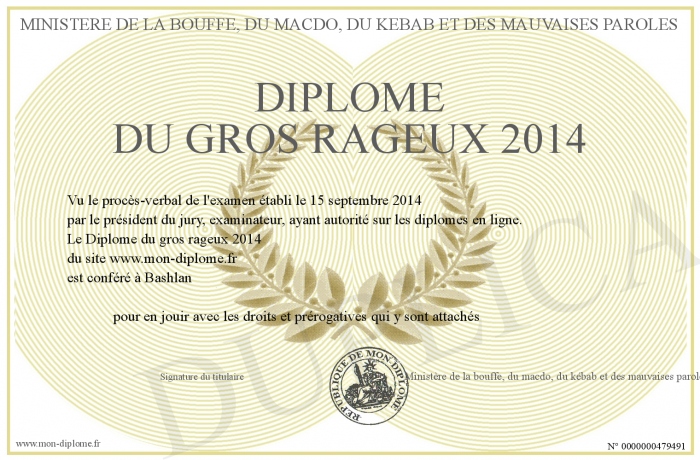 Envoyez par email votre Diplôme du gros rageux 2014 personalisé