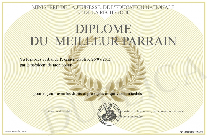 Envoyez par email votre Diplôme du meilleur Parrain personalisé