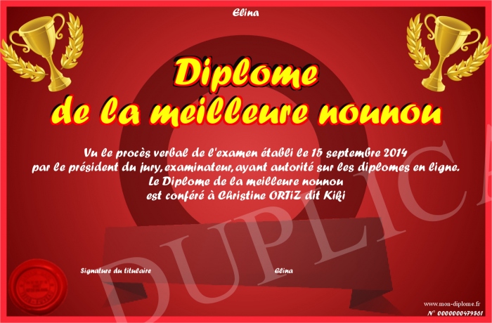 Envoyez par email votre Diplôme de la meilleure nounou personalisé