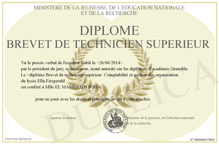 Envoyez par email votre Diplôme Brevet de technicien supérieur personalisé