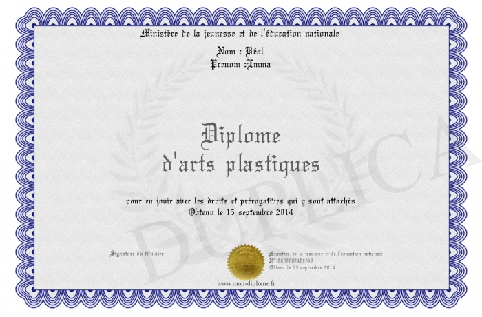 Envoyez par email votre Diplôme d'arts plastiques personalisé