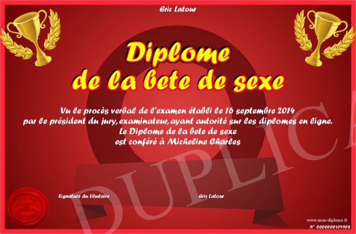 Envoyez par email votre Diplôme de la bete de sexe personalisé
