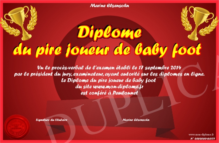 Envoyez par email votre Diplôme du pire joueur de baby foot personalisé