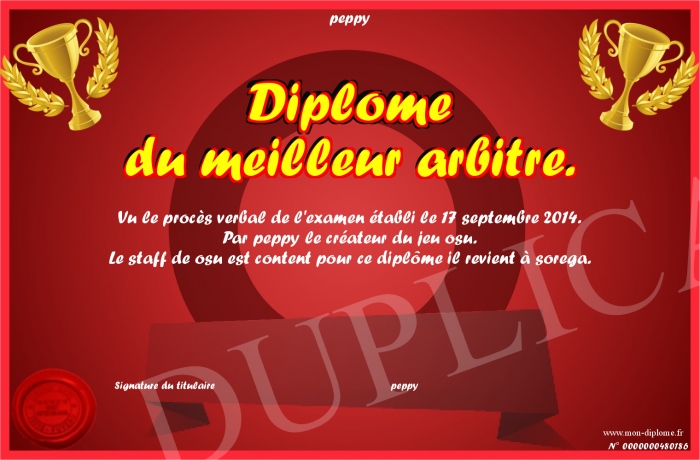 Envoyez par email votre Diplôme du meilleur arbitre. personalisé
