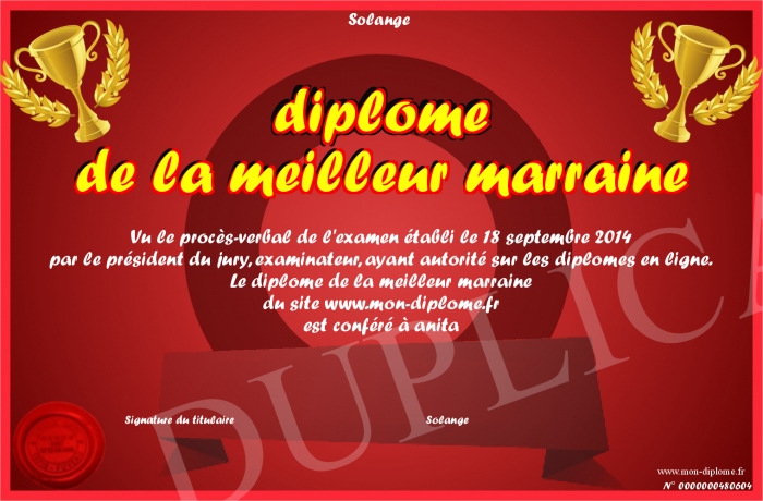 Envoyez par email votre diplome de la meilleur marraine personalisé