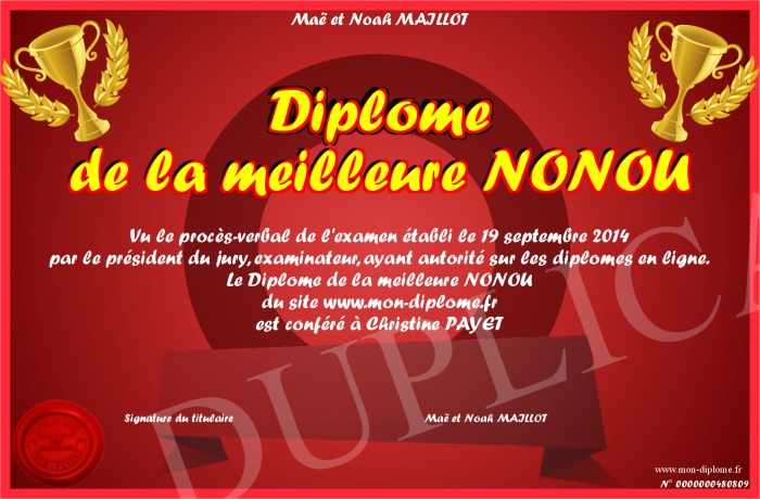 Envoyez par email votre Diplome de la meilleure NONOU personalisé