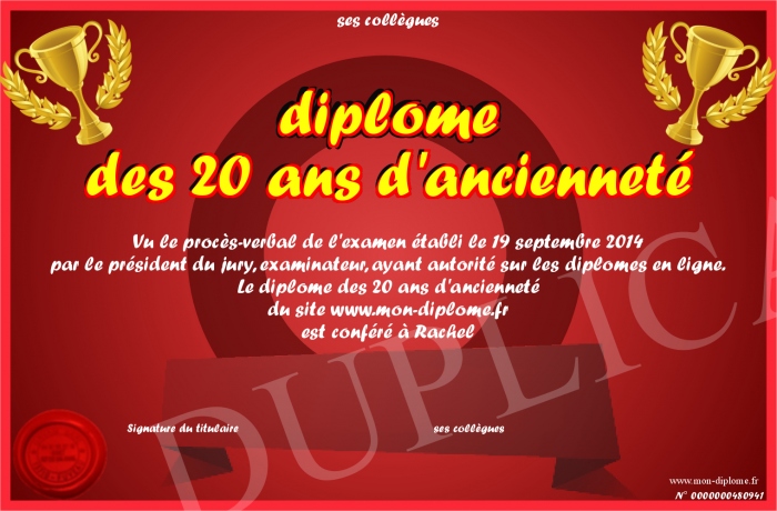 Envoyez par email votre diplôme des 20 ans d'ancienneté personalisé