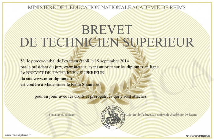 Envoyez par email votre BREVET DE TECHNICIEN SUPERIEUR personalisé