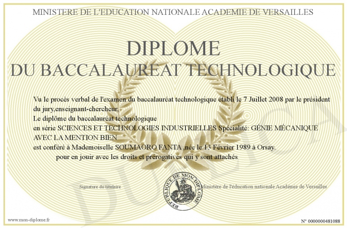 Envoyez par email votre diplome du baccalauréat technologique personalisé