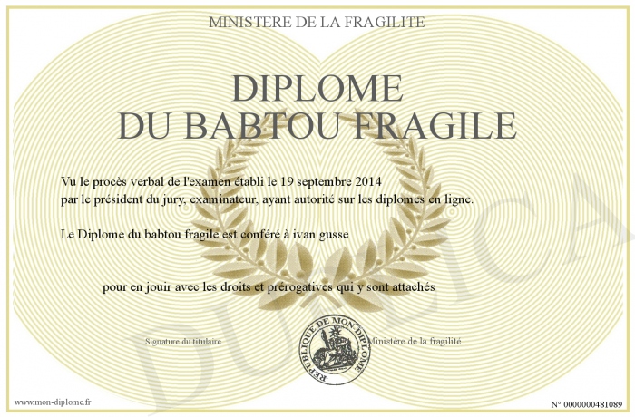 Envoyez par email votre Diplôme du babtou fragile personalisé