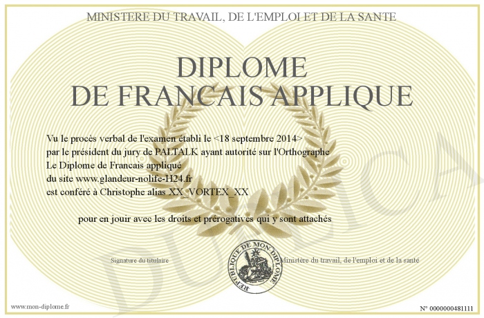 Envoyez par email votre Diplome de Francais appliqué personalisé
