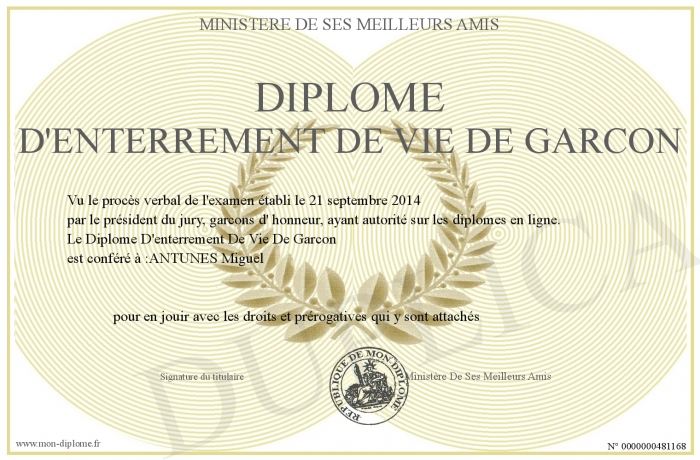 Envoyez par email votre Diplôme D'enterrement De Vie De Garcon personalisé