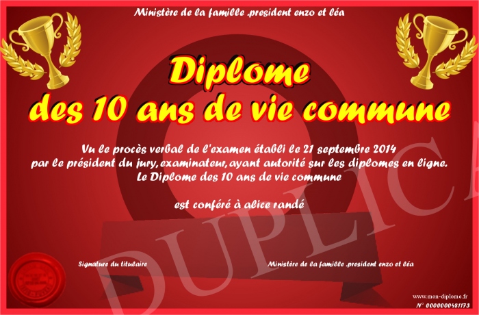 Envoyez par email votre Diplôme des 10 ans de vie commune personalisé