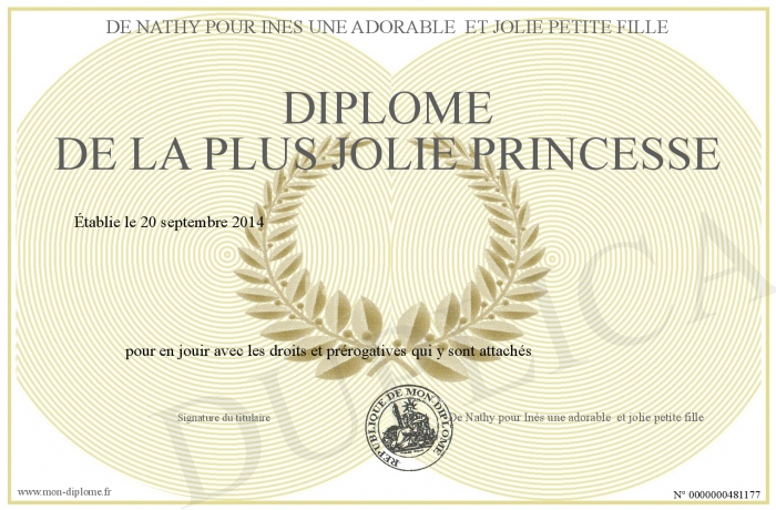 Envoyez par email votre Diplôme de la plus jolie princesse personalisé