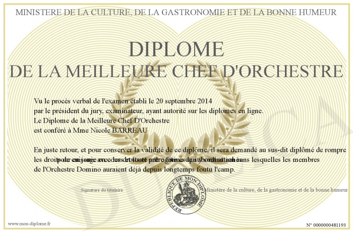 Envoyez par email votre Diplôme de la Meilleure Chef D'Orchestre personalisé