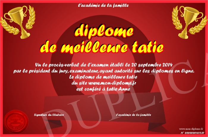 Envoyez par email votre diplome de meilleure tatie personalisé