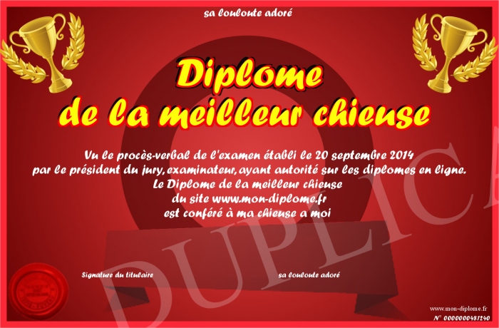 Envoyez par email votre Diplôme de la meilleur chieuse personalisé
