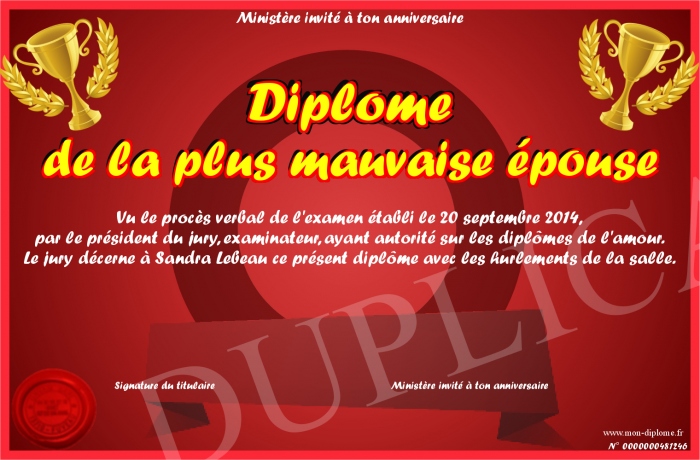 Envoyez par email votre Diplôme de la plus mauvaise épouse personalisé