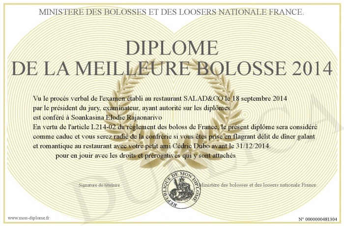 Envoyez par email votre Diplôme de la meilleure bolosse 2014 personalisé