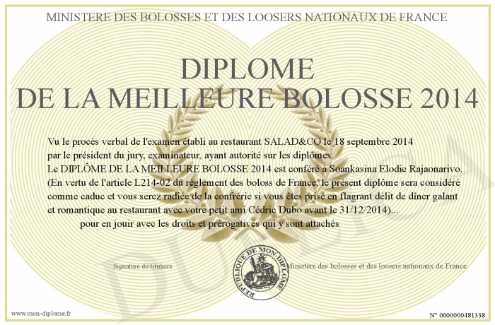 Envoyez par email votre Diplôme de la meilleure bolosse 2014 personalisé