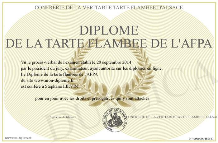 Envoyez par email votre Diplôme de la tarte flambée de l'AFPA personalisé