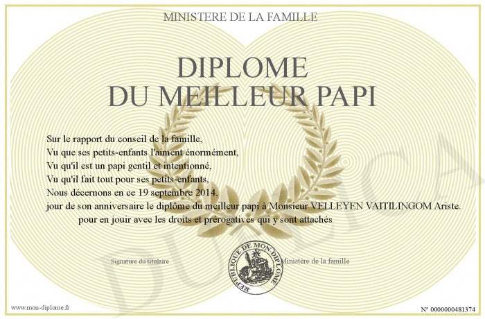 Envoyez par email votre Diplôme du meilleur papi personalisé
