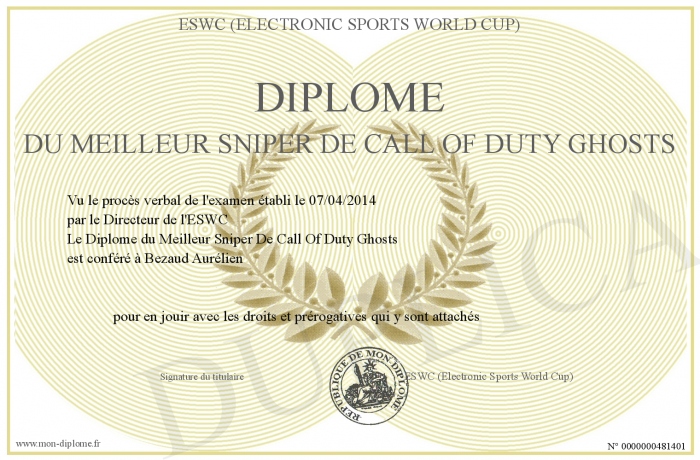 Envoyez par email votre Diplôme du Meilleur Sniper De Call Of Duty Ghosts personalisé