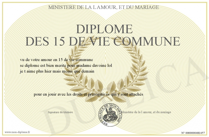 Envoyez par email votre Diplôme des 15 de vie commune personalisé