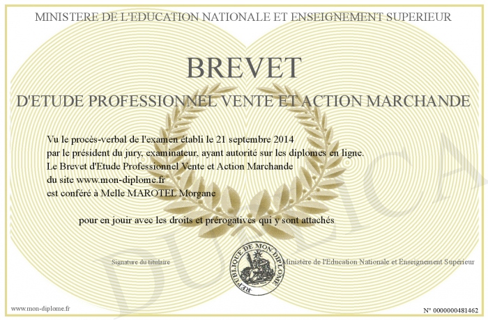 Envoyez par email votre Brevet d'Etude Professionnel Vente et Action Marchande personalisé