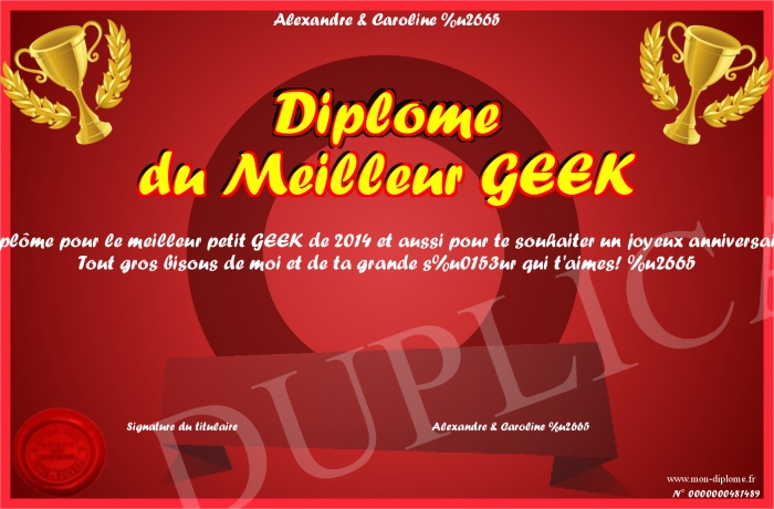 Envoyez par email votre Diplôme du Meilleur GEEK personalisé