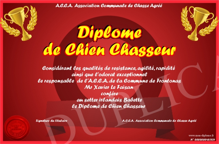 Envoyez par email votre Diplome de Chien Chasseur personalisé