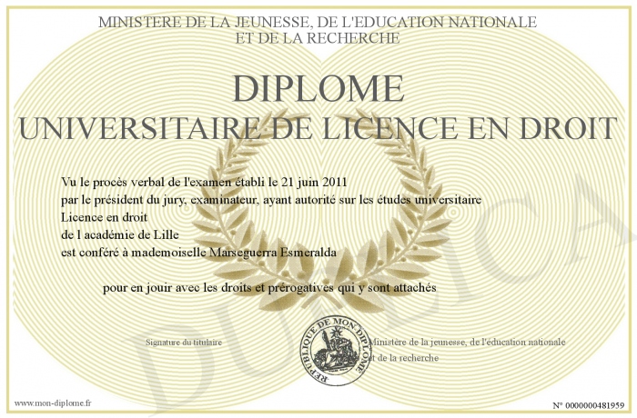 Envoyez par email votre Diplome universitaire de licence en droit personalisé