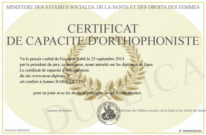 Envoyez par email votre certificat de capacité d'orthophoniste personalisé