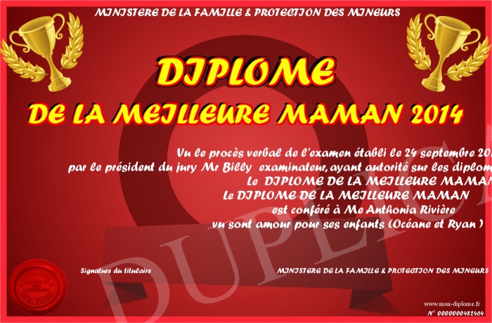 Envoyez par email votre DIPLOME DE LA MEILLEURE MAMAN 2014 personalisé