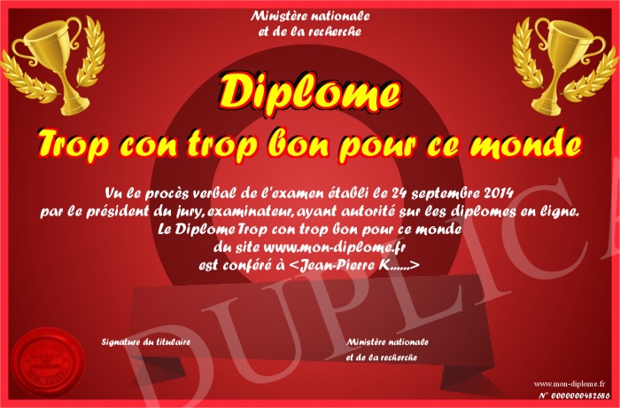 Envoyez par email votre Diplôme Trop con trop bon pour ce monde personalisé