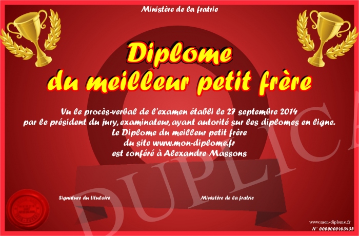Envoyez par email votre Diplôme du meilleur petit frère personalisé