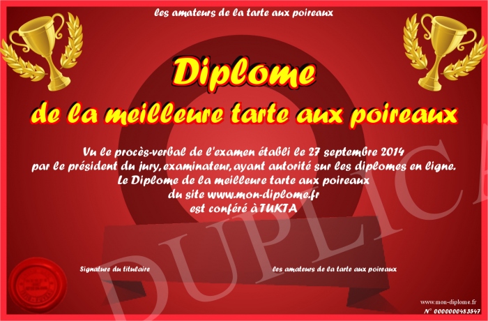 Envoyez par email votre Diplôme de la meilleure tarte aux poireaux personalisé