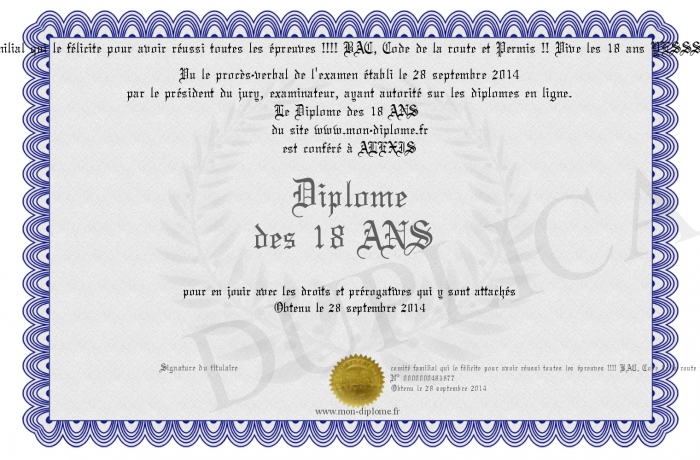 Envoyez par email votre Diplôme des 18 ANS personalisé