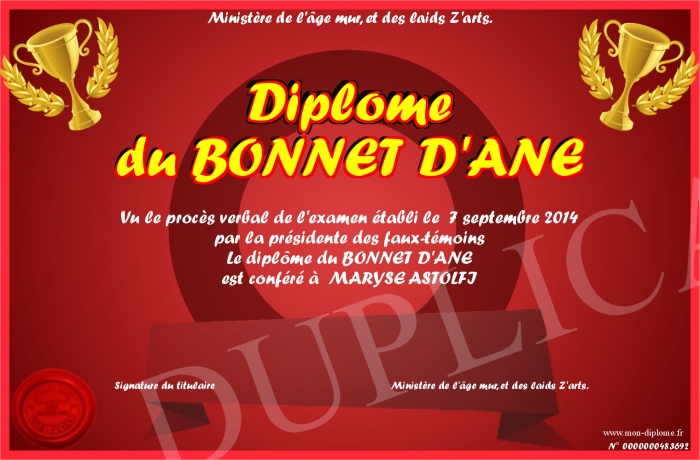 Envoyez par email votre Diplôme du BONNET D'ANE personalisé