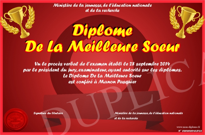 Envoyez par email votre Diplôme De La Meilleure Soeur personalisé