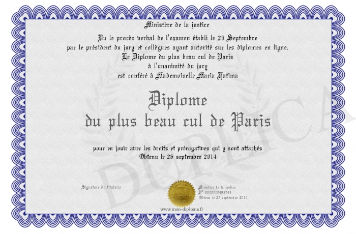 Envoyez par email votre Diplôme du plus beau cul de Paris personalisé