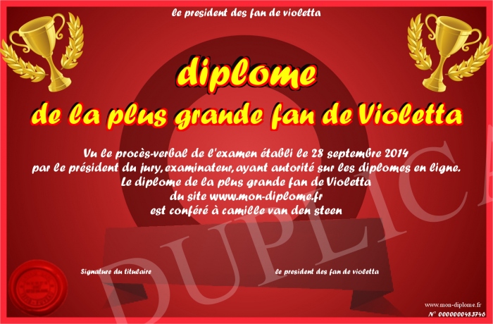 Envoyez par email votre diplôme de la plus grande fan de Violetta personalisé