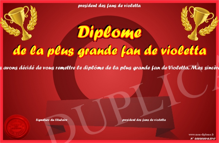 Envoyez par email votre Diplôme de la plus grande fan de violetta personalisé