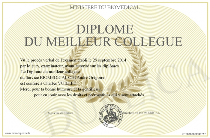 Envoyez par email votre Diplôme du meilleur collegue personalisé