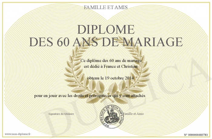 Envoyez par email votre Diplôme des 60 ans de mariage personalisé
