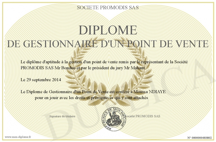Envoyez par email votre Diplôme de Gestionnaire d'un Point de Vente personalisé