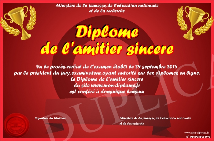 Envoyez par email votre Diplôme de l'amitier sincere personalisé