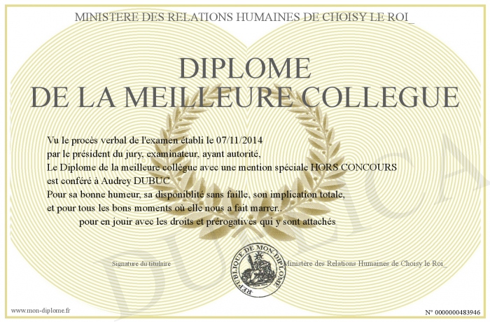 Envoyez par email votre Diplôme de la meilleure collègue personalisé