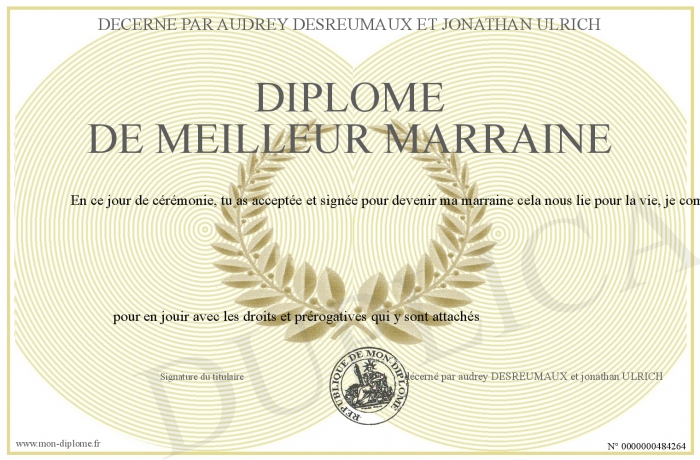 Envoyez par email votre Diplome de meilleur marraine personalisé