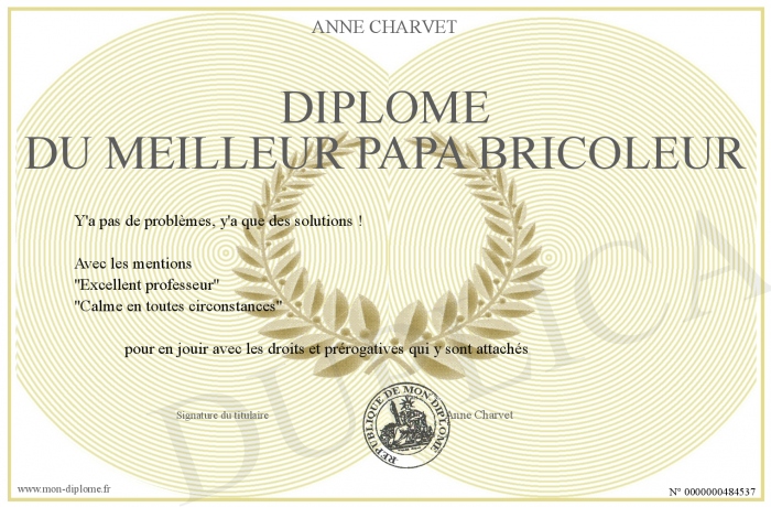 Envoyez par email votre Diplôme du meilleur papa bricoleur personalisé